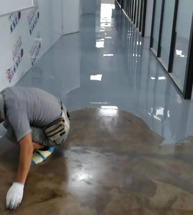 徹底清除地面各種污垢后用專用清洗劑進(jìn)行清理,使其達(dá)到涂裝要求。如果油污浸透到水泥基層較深,清洗后還應(yīng)通過物理加熱的方法進(jìn)行處理。素地不平或空鼓區(qū)域需使用環(huán)氧砂漿補(bǔ)平地面。