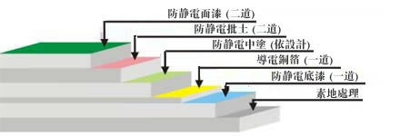 在施工靜電面漆前,先測試中涂導(dǎo)電層的電阻,要求在10^4Ω以下,這樣面漆層電阻才能控制在10^6Ω-10^9Ω以下,達(dá)到防靜電效果,均勻施工面漆一次。