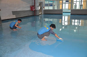 5. 環(huán)氧自流平面漆: 用自流平面漆均勻鏝涂一道,完工后整體地面達(dá)到光亮潔凈,顏色均一,無空鼓,注意先后施工交接處的處理;涂層要求均勻,無流掛,無針孔、光潔、平整。 |